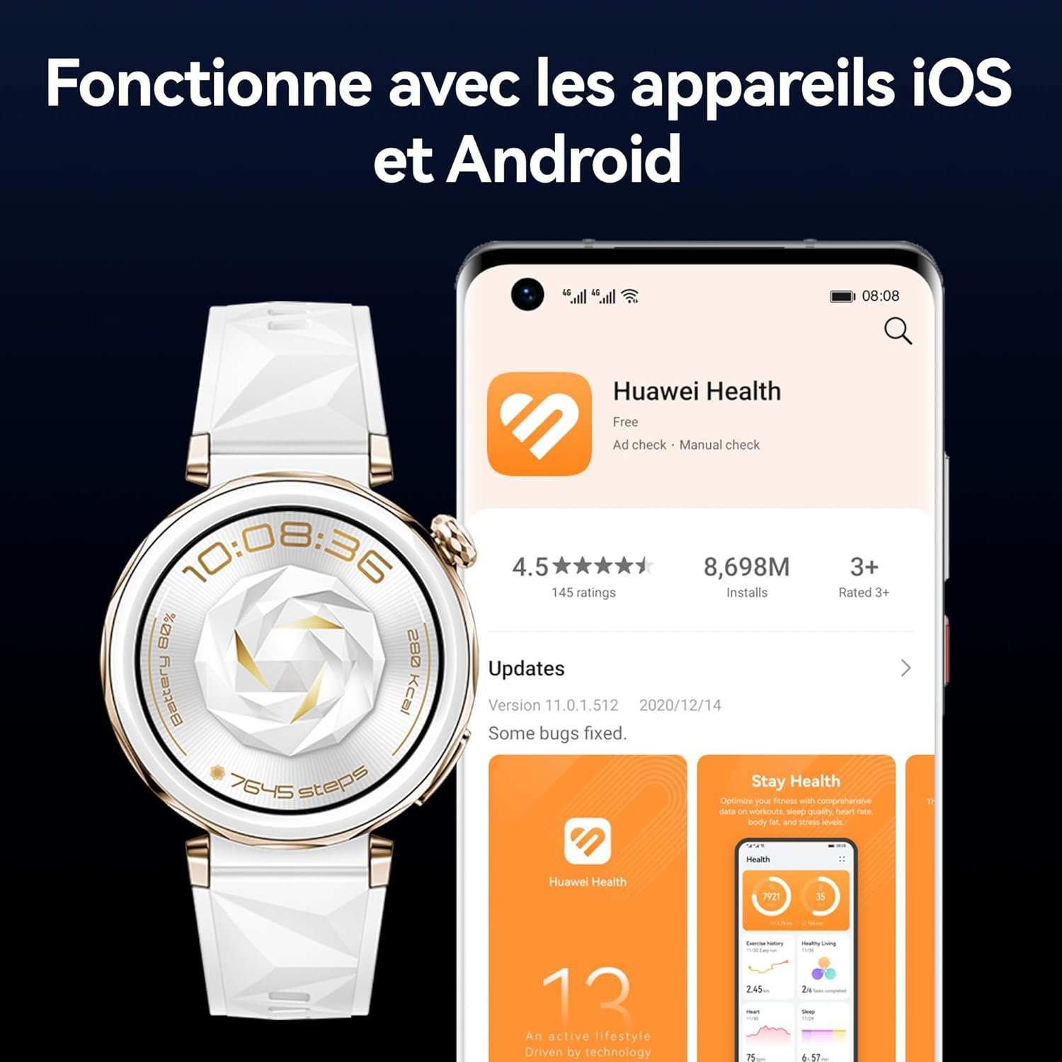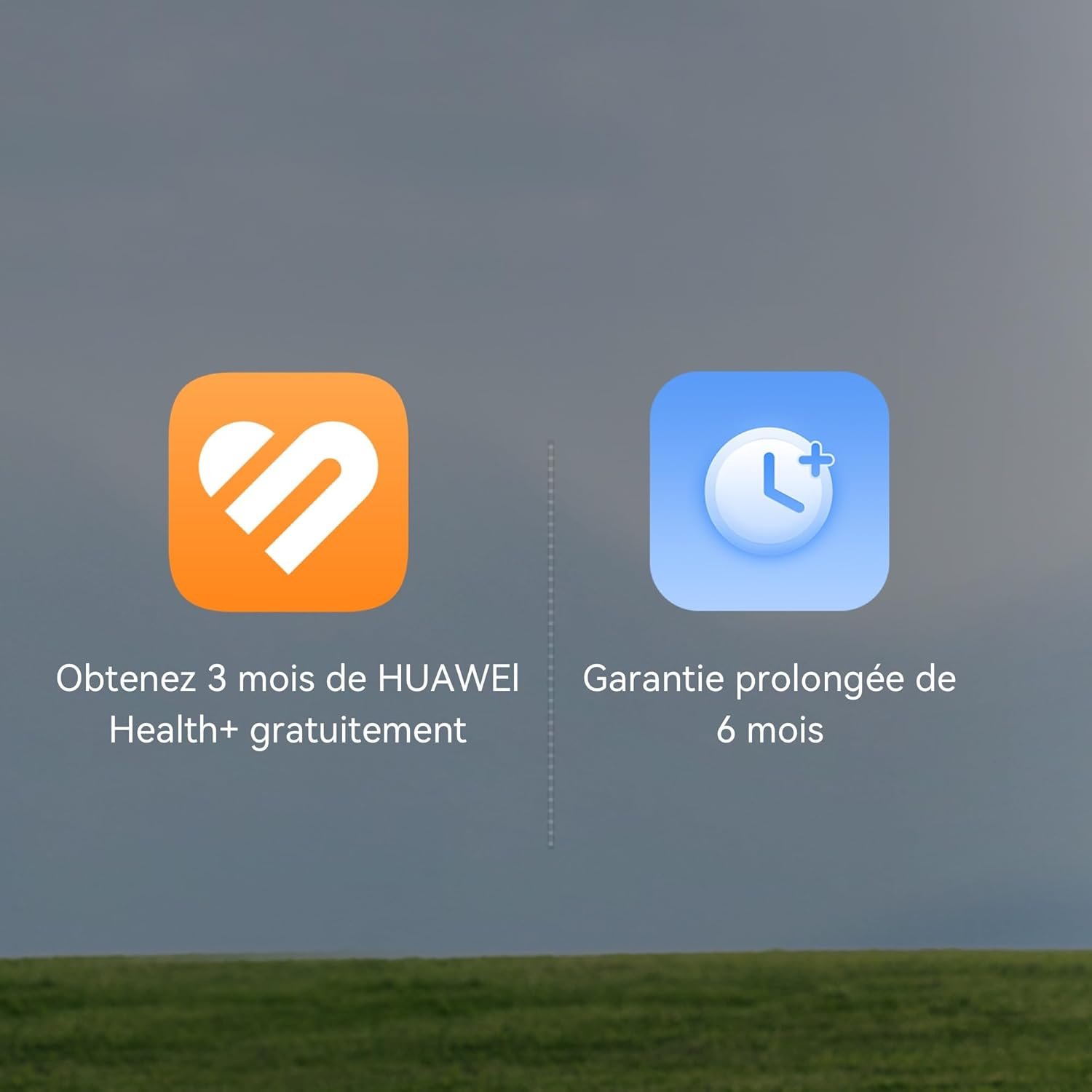 - 【HUAWEI Santé+】: Achetez une montre de la série HUAWEI WATCH GT 5 et bénéficiez d’un abonnement de 3 mois à HUAWEI Santé+ pour avoir accès à une multitude d’avantages exclusifs, dont des séances d’entraînement de niveau débutant à avancé, des méditations guidées, un plan de remise en forme et des exercices de respiration.